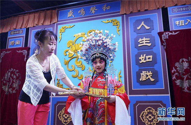 8月20日,河北省秦皇島市北戴河“裴艷玲藝術傳承基地”的老師在培訓孩子表演京劇。