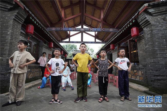 8月20日,孩子們在河北省秦皇島市北戴河“裴艷玲藝術傳承基地”學習表演京劇。