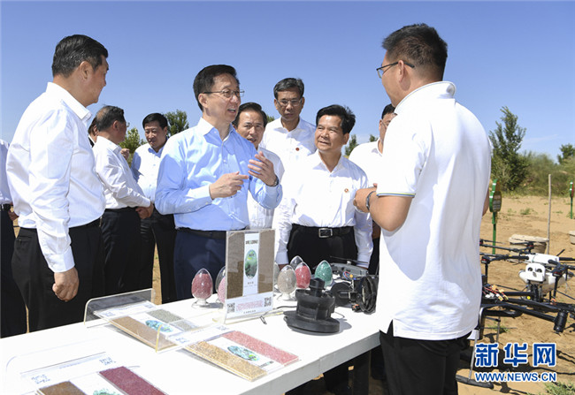 8月26日至27日,中共中央政治局常委、國務院副總理韓正到內蒙古自治區(qū)鄂爾多斯市,就庫布其沙漠防沙治沙和生態(tài)建設情況進行調研。這是8月27日,韓正來到位于庫布其沙漠腹地的沙峰綠谷,實地查看科技手段治沙成果。新華社記者 張領 攝