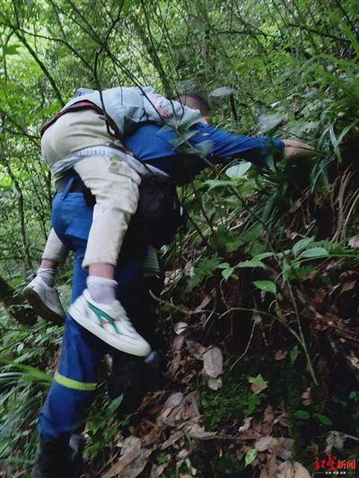 救援人員背著孩子穿越原始森林
