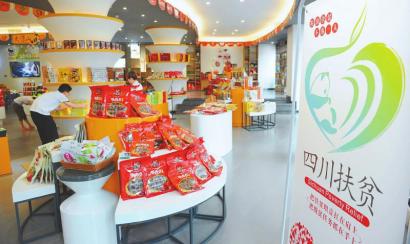 在四川特產購物中心內售賣的貼有“四川扶貧”公益性集體商標的產品。四川日報記者何海洋攝