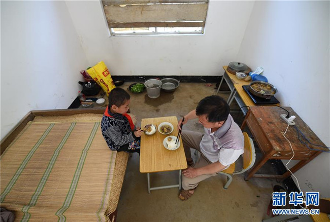 在廣西都安瑤族自治縣菁盛鄉(xiāng)義德小學(xué)弄豆教學(xué)點,藍(lán)啟飛老師和學(xué)生藍(lán)孟源一起吃午餐(2015年4月15日攝)。當(dāng)時,藍(lán)啟飛是這所學(xué)校唯一的老師,藍(lán)孟源是這所學(xué)校唯一的學(xué)生。新華社記者 陸波岸 攝
