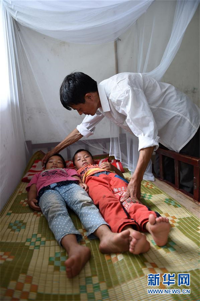 在廣西東蘭縣三石鎮(zhèn)泗爺小學(xué),黃英雄老師在照顧學(xué)生睡午覺(2014年9月10日攝)。新華社記者 陸波岸 攝