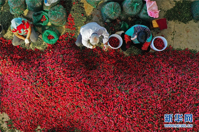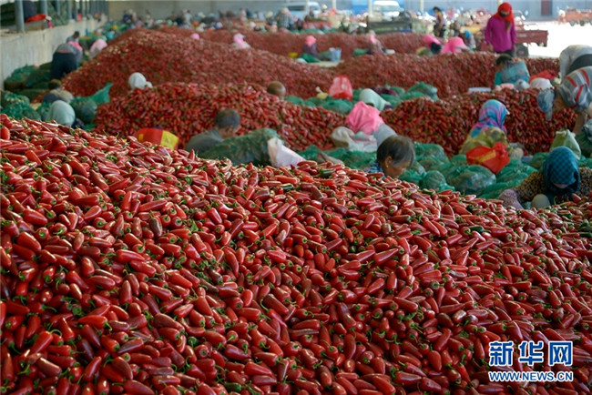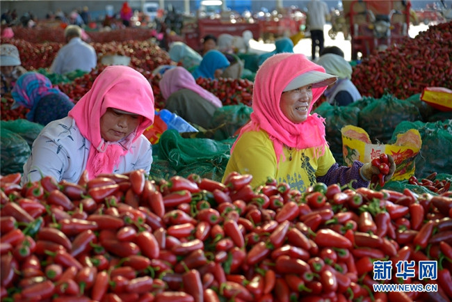 這是近日在甘肅省高臺縣拍攝的辣椒分揀、挑選場景。時(shí)下,高臺縣宣化鎮(zhèn)和駱駝城鎮(zhèn)種植的1700畝墨西哥辣椒進(jìn)入采摘和收購期,火紅的辣椒堆積如山,映紅了農(nóng)民的笑臉。新華網(wǎng)發(fā)(鄭耀德 攝)