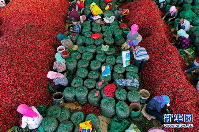 甘肅高臺千畝辣椒獲豐收 堆積如山紅似火