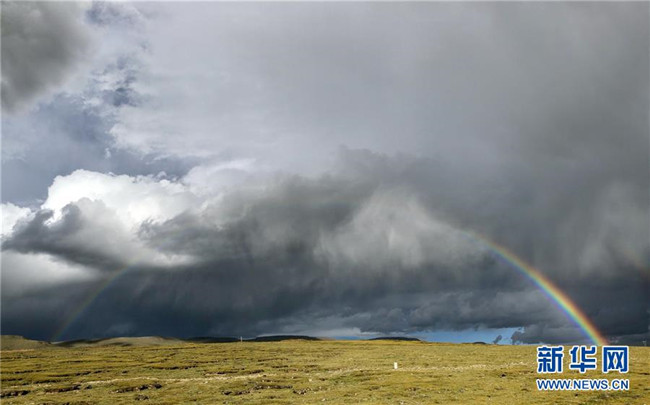 在青海省玉樹藏族自治州治多縣用手機拍攝的雨后彩虹(9月11日攝)。新華社記者鄒樂攝
