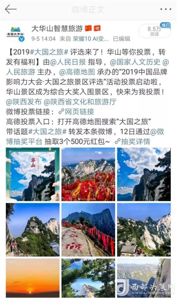 2019大國之旅景區(qū)評選活動由人民日報社指導,《國家歷史人文》雜志社、人民旅游主辦,高德地圖承辦,于9月2日正式啟動。此次活動采取大眾投票+高德地圖旅游大數(shù)據(jù)+專家及媒體評審相結合的形式,得出最終獲獎名單。游客通過新浪微博關注景區(qū)官博“ 大華山智慧旅游”為華山景區(qū)投票,智旅公司協(xié)助高德地圖完善了華山景區(qū)地圖板塊的校準和更新,此次活動的開展,華山景區(qū)的品牌影響力和知名度也再次得到提升。