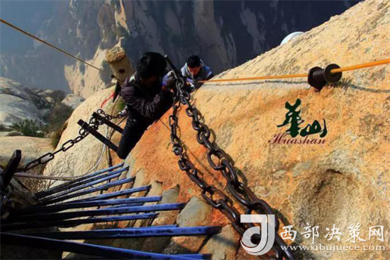 長空棧道位于華山南峰東側(cè)山腰,是華山派第一代宗師元代高道賀志真為遠離塵世靜修成仙,在萬仞絕壁上鑲嵌石釘搭木椽而筑。棧道上下皆是懸崖絕壁,鐵索橫懸,由條石搭成尺許路面,下由石柱固定,游人至此,面壁貼腹,屏氣挪步,被譽為“華山第一天險”。由于棧道險峻,故當?shù)厝擞?ldquo;小心九厘三分,要尋尸首,洛南商州”之說。這里只是探險之道,并非登山必由之路,膽小人就在升表臺看看也就行了。所以石刻上不少警告之語:“懸崖勒馬”等。(供稿:華旅集團營銷中心)