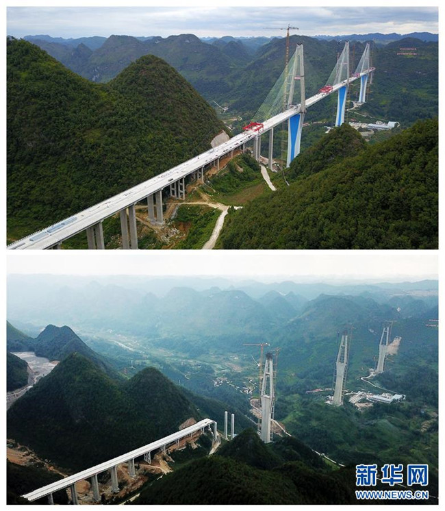 拼版照片:上圖為2019年9月20日無人機拍攝的平塘特大橋;下圖為2018年9月25日拍攝的平塘特大橋。新華社記者楊文斌攝