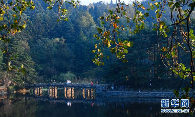 游客在廬山風景區(qū)內(nèi)的如琴湖邊游玩(10月9日攝)。新華社記者 胡晨歡 攝