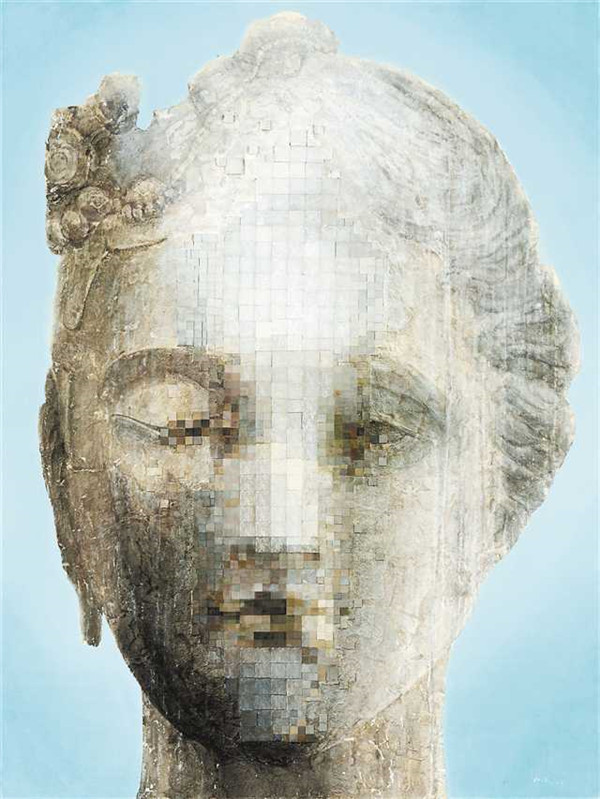早在2017年,劉冠儒就開始制作以中西方雕塑為主題的綜合材料繪畫作品,《融》則是他首次將東西方雕塑的形象融為一體。作品中的“維納斯”頭像,左邊為東方形象,右邊為西方形象,中間是馬賽克。馬賽克部分由300多個大小不同的紙板粘貼而成,作者在紙板上面反復打磨和暈染,形成豐富的肌理效果。