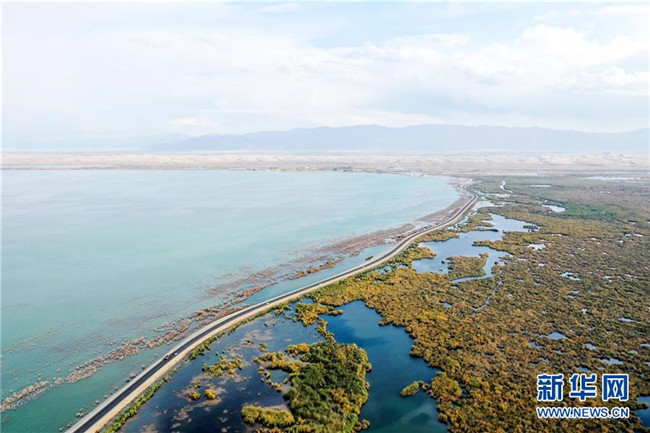 這是新疆博斯騰湖河堤公路(10月12日無人機拍攝)。入秋以來,新疆博斯騰湖碧波蕩漾,美景如畫,吸引各地游客前來游玩。新華社記者丁磊攝