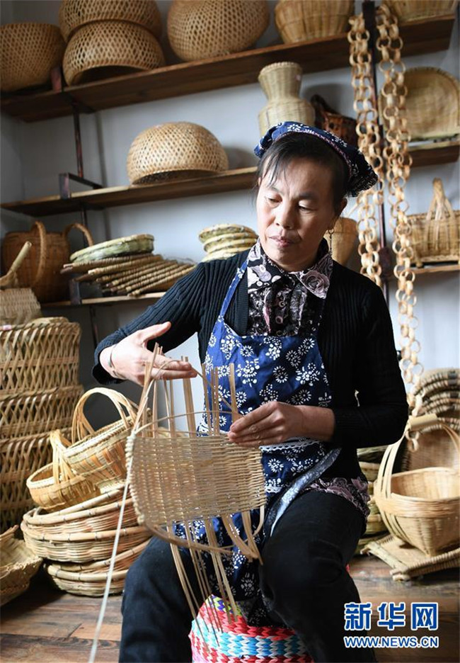 10月16日,團結(jié)村的“巧媳婦”袁悅花在編織竹制家庭用具。 新華社記者 楊宗友 攝