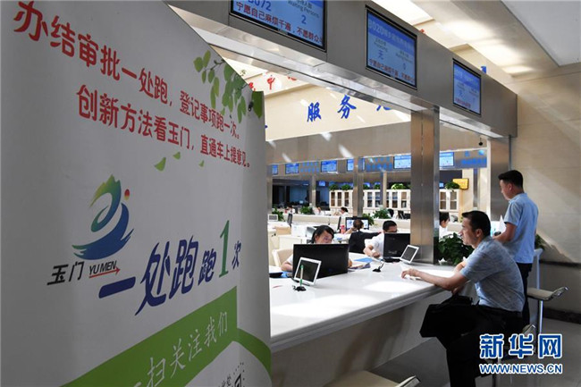 市民在甘肅省玉門(mén)市民中心服務(wù)大廳窗口辦理業(yè)務(wù)(2018年8月17日攝)。2017年以來(lái),甘肅省玉門(mén)市不斷深化“放管服”改革,推行“一窗辦一網(wǎng)辦簡(jiǎn)化辦馬上辦”,將當(dāng)?shù)馗鞑块T(mén)所有行政審批和公共服務(wù)事項(xiàng)向市民中心服務(wù)大廳集中,在網(wǎng)絡(luò)上向電子政務(wù)平臺(tái)集中。 新華社記者 范培珅 攝