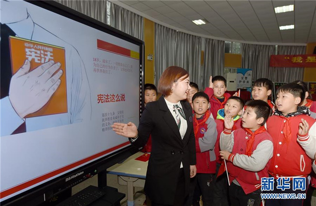 安徽省合肥市經(jīng)開(kāi)區(qū)明珠居委會(huì)法律援助律師在給明珠小學(xué)的學(xué)生們講解憲法知識(shí)(2018年12月3日攝)。 新華社記者 郭晨 攝