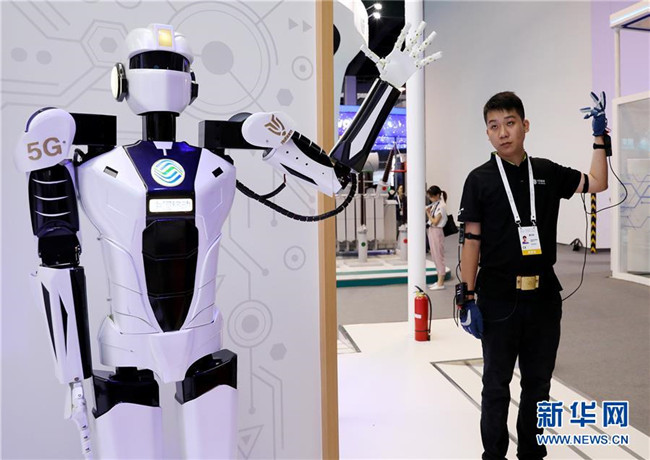 一名工作人員(右)在上海舉行的2019世界人工智能大會上演示一款基于5G網(wǎng)絡(luò)實現(xiàn)遠(yuǎn)程控制的機器人(8月29日攝)。新華社記者 方喆攝