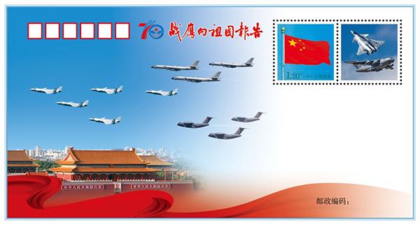 《戰(zhàn)鷹向祖國(guó)報(bào)告》紀(jì)念封之一。 10月18日,慶祝人民空軍成立70周年航空開(kāi)放活動(dòng)迎來(lái)首個(gè)公眾日,空軍在活動(dòng)現(xiàn)場(chǎng)發(fā)布一套兩枚強(qiáng)軍主題紀(jì)念封《戰(zhàn)鷹向祖國(guó)報(bào)告》,展現(xiàn)空軍殲-20、運(yùn)-20、轟-6N等新型戰(zhàn)機(jī)的藍(lán)天英姿。