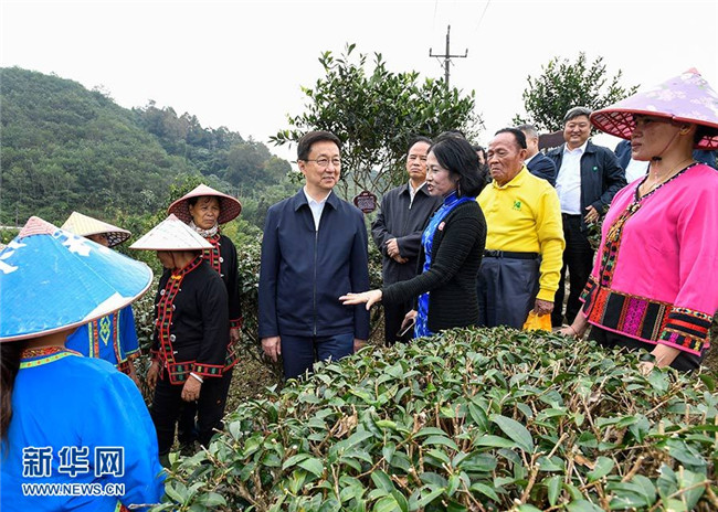 11月9日至11日,中共中央政治局常委、國務院副總理韓正在海南調研。圖為11月10日,韓正在五指山椰仙有機茶生態(tài)觀光園,了解高山雨林有機茶種植等特色產(chǎn)業(yè)培育、病蟲害物理防治、種植產(chǎn)業(yè)和旅游產(chǎn)業(yè)融合發(fā)展等情況,與正在茶園工作的當?shù)剞r(nóng)民和貧困戶交流。 新華社記者 高潔 攝
