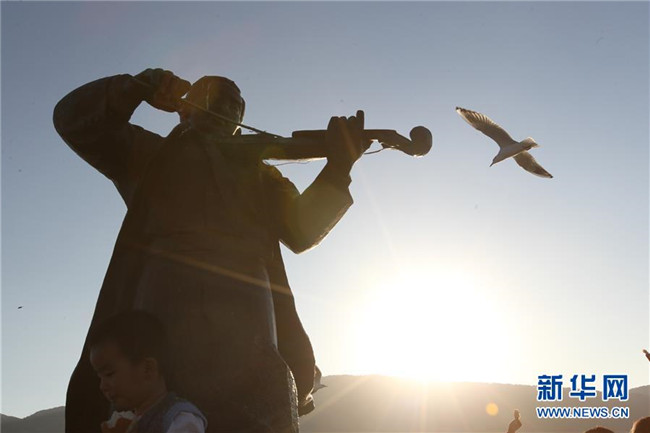 11月16日,一只紅嘴鷗飛過(guò)滇池岸邊的聶耳雕塑。 新華社記者 金林鵬 攝