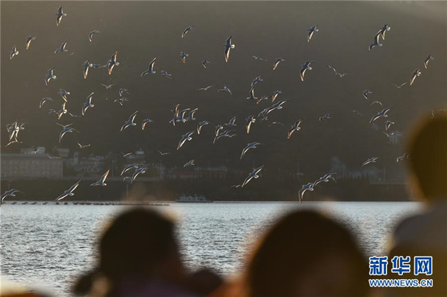 11月16日,游客在滇池觀(guān)賞紅嘴鷗。 新華社記者 李芒茫 攝