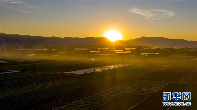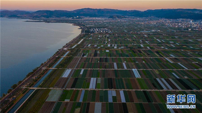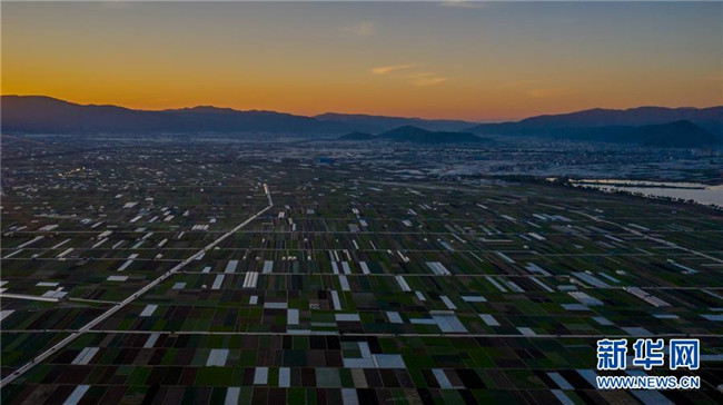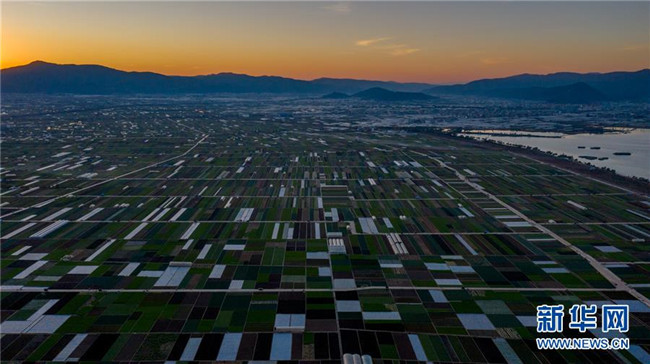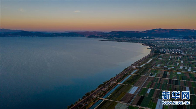 這是云南省玉溪市通??h的田園風光(11月23日無人機拍攝)。初冬時節(jié),云南省玉溪市通海縣風景秀麗,山巒、湖水與農(nóng)田組成了一幅美麗的田園詩畫卷。新華社記者胡超攝