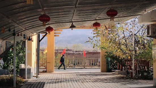 走進沙坡頭新村童家園子,黃墻紅瓦的農宅,干凈整潔的道路,各種果樹掩映中,一座座小院各有特色。因為天氣轉涼,過了旅游季,大部分的農家小院已經歇業(yè),只有兩三家還在開門營業(yè)。