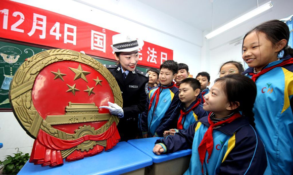 2019年12月3日,在第六個(gè)“國(guó)家憲法日”到來之際,山東省棗莊市公安局嶧城分局交警大隊(duì)一名交警在荀子小學(xué)為學(xué)生們普及憲法知識(shí)。吉喆 攝(人民圖片)