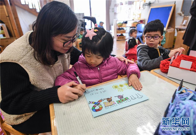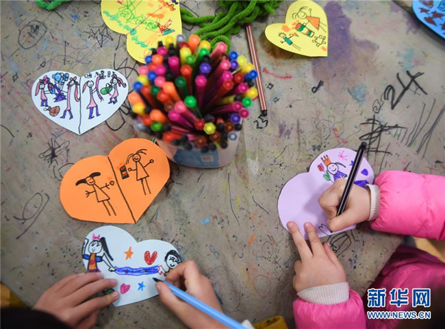 12月11日,小朋友在老師的帶領(lǐng)下繪制愛心卡片,準(zhǔn)備隨圍巾一起寄給西藏的小朋友們。 新華社記者 徐昱 攝