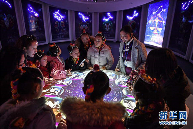 12月14日,拉薩市實驗小學(xué)學(xué)生在藏域星球天文科普體驗館學(xué)習(xí)星座知識。當(dāng)日,藏域星球天文科普體驗館在西藏拉薩開館試運營,這是西藏第一家天文科普體驗館。據(jù)介紹,此館以感知宇宙、認知宇宙、探索宇宙為主題,以參觀者的第一感官體驗為設(shè)計導(dǎo)向,利用互動投影、懸浮投影、物體跟蹤、人體捕捉、體感互動、VR等高科技手段展示藏地的神秘,揭示宇宙的奧秘。新華社記者李鑫攝