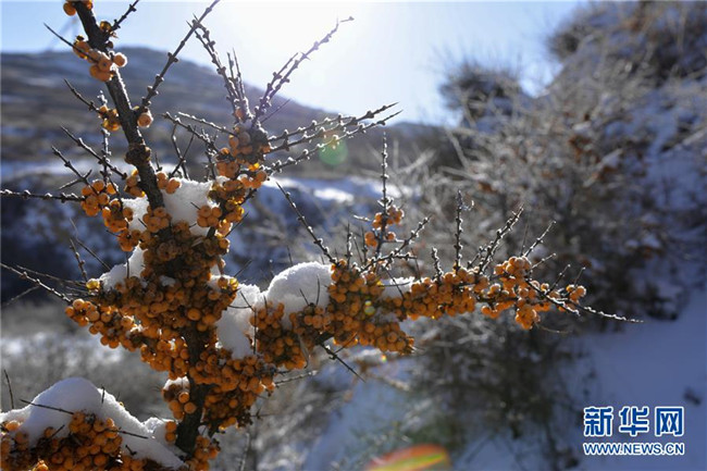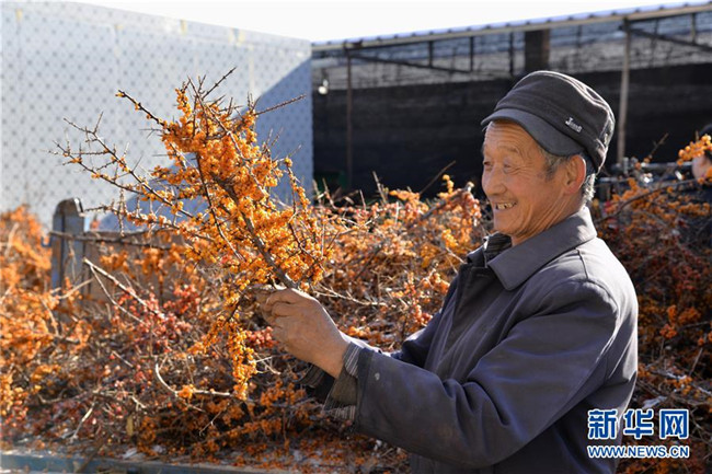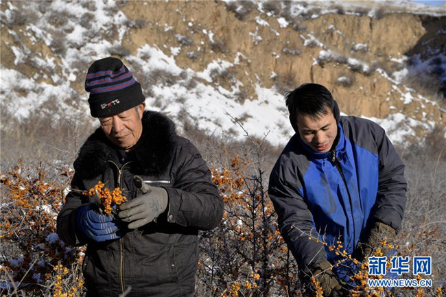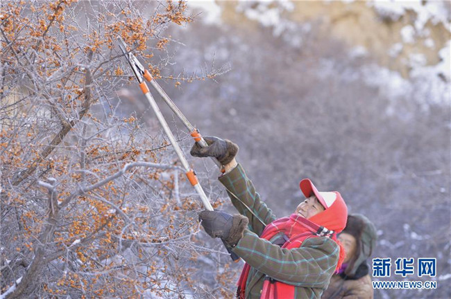 12月18日,當(dāng)?shù)厝罕娫谇逅涌h野生沙棘保護(hù)地采摘沙棘果。  新華社記者 徐欽 攝