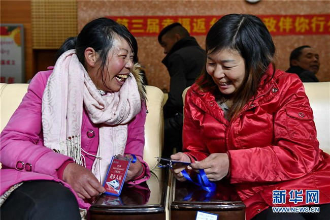 12月23日,受助務(wù)工人員在拉薩火車站返鄉(xiāng)人員休息區(qū)交流。新華社記者 張汝鋒 攝