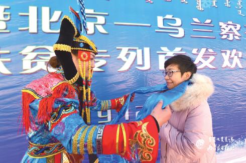 來自首都北京等地、乘坐首列北京——烏蘭察布高鐵冰雪旅游扶貧專列的150多名游客和“發(fā)現(xiàn)最美鐵路·探訪百年京綏”活動暨烏蘭察布青年“邂逅高鐵時代”心動之旅活動團(tuán)隊在儀式現(xiàn)場受到熱情歡迎。