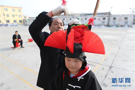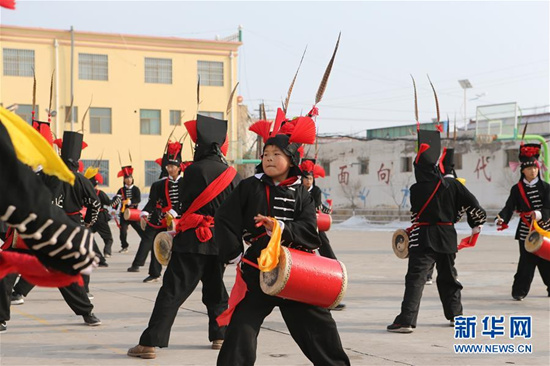 攻鼓子是發(fā)源于甘肅武威的一種民間鼓樂舞蹈,表演風格渾厚豪邁、威武雄壯,具有強烈的地域特色。2008年,涼州攻鼓子被列為第二批國家級非物質(zhì)文化遺產(chǎn)。為更好地傳承這項非物質(zhì)文化遺產(chǎn),甘肅省武威市涼州區(qū)四壩鎮(zhèn)九年制學(xué)校組建攻鼓子藝術(shù)社團,開設(shè)攻鼓子校本課,定期由當?shù)毓ス淖哟硇詡鞒腥藢W(xué)生進行指導(dǎo),推動“非遺”攻鼓子藝術(shù)教育普及。 新華社記者 耿馨寧 攝