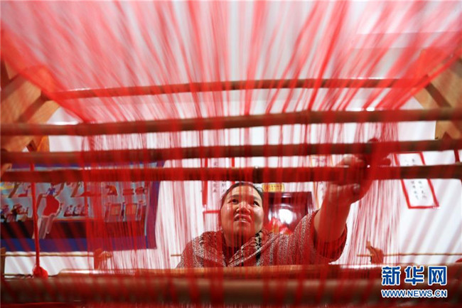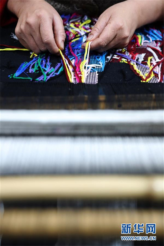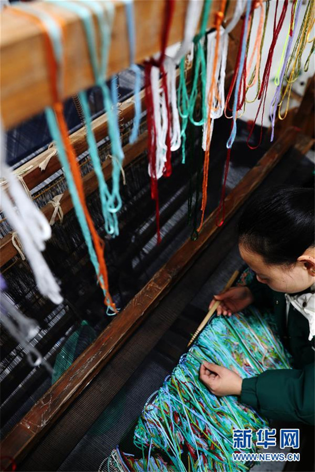 1月14日,在重慶市黔江區(qū)小南海鎮(zhèn)土家十三寨“西蘭卡普扶貧工坊”,員工在編織西蘭卡普。 新華社發(fā)(楊敏 攝)