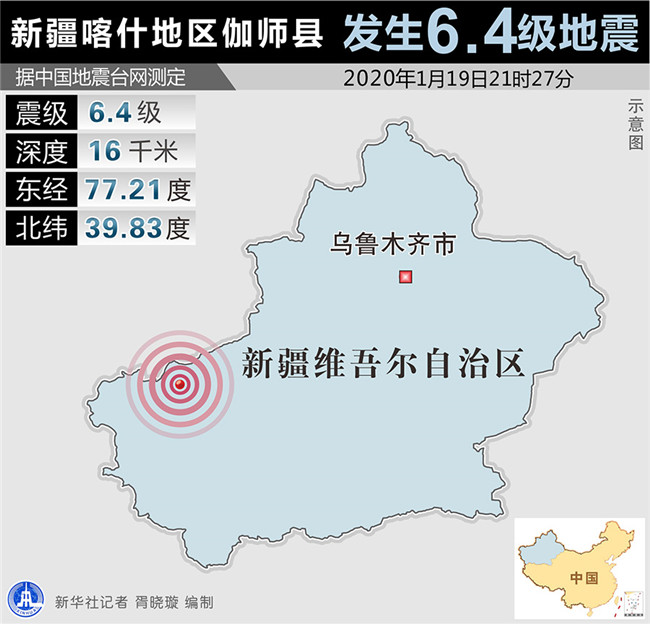 據(jù)中國地震臺網正式測定,19日21時27分在新疆喀什地區(qū)伽師縣發(fā)生6.4級地震,震源深度16千米,震中位于北緯39.83度,東經77.21度。
