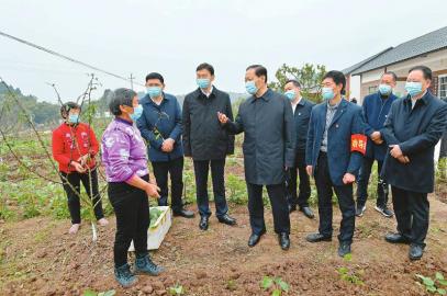 春回大地,正是春耕好時(shí)節(jié)。黎明村村民搶抓農(nóng)時(shí),有的在翻耕土地,有的正給田間作物澆水施肥,有的在播種早春玉米,一片忙碌景象。彭清華走進(jìn)村口的花椒基地,與套種茄子秧苗的村民親切交談,詢問栽種面積、土壤墑情、生長(zhǎng)周期、市場(chǎng)銷路等情況。他說,一年之計(jì)在于春,切實(shí)抓好春耕生產(chǎn)對(duì)于實(shí)現(xiàn)全年豐產(chǎn)豐收意義重大。農(nóng)時(shí)不等人,要在嚴(yán)格落實(shí)防控措施的同時(shí),及時(shí)推進(jìn)春季農(nóng)業(yè)生產(chǎn)和生豬恢復(fù)生產(chǎn),因地制宜調(diào)整種養(yǎng)業(yè)結(jié)構(gòu),確保穩(wěn)產(chǎn)保供和農(nóng)民持續(xù)增收。有關(guān)部門要繼續(xù)做好服務(wù)保障,加強(qiáng)技術(shù)指導(dǎo),強(qiáng)化農(nóng)資儲(chǔ)備、調(diào)劑和配送,搞好產(chǎn)銷銜接,讓生產(chǎn)資料進(jìn)得來(lái)、農(nóng)產(chǎn)品賣得出。對(duì)隔離觀察群眾要做好生產(chǎn)扶持工作,幫助他們克服困難、不誤農(nóng)時(shí)。