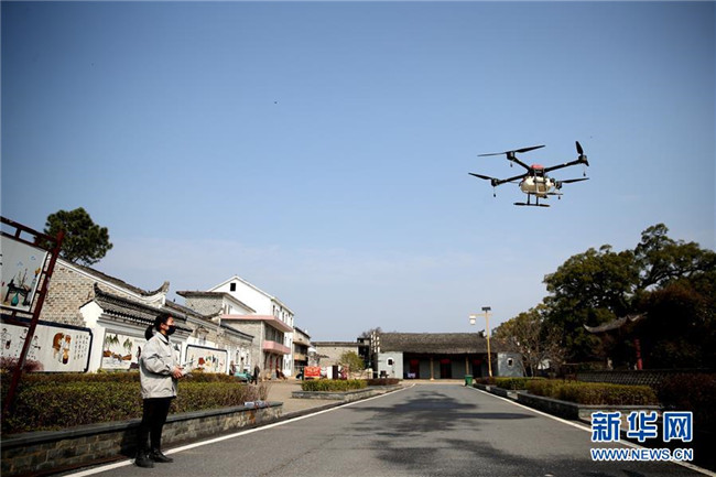 在江西省吉安市峽江縣馬埠鎮(zhèn)上蓋村,農(nóng)機合作社飛手操作無人機進(jìn)行消殺作業(yè)(2月1日攝)。 新華社發(fā)(陳福平 攝)