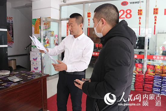 3月10日,內(nèi)蒙古興安盟扎賚特旗種子管理站副站長(zhǎng)史磊(右)發(fā)放監(jiān)管告知書。李敏 攝