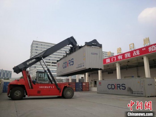13萬(wàn)只口罩等防疫物資裝箱搭乘中歐班列(成都)緊急運(yùn)往歐洲。 成都國(guó)際鐵路港供圖