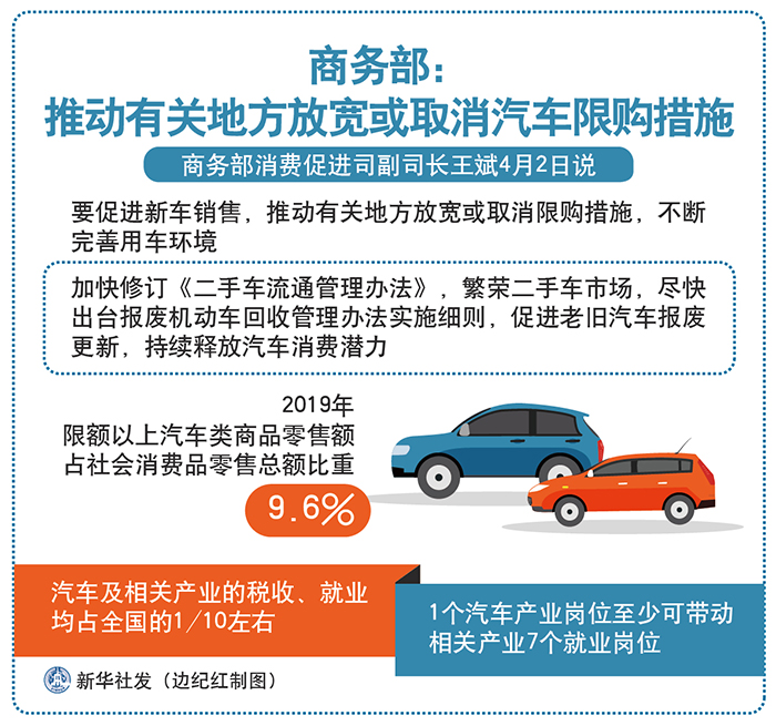 商務(wù)部消費(fèi)促進(jìn)司副司長(zhǎng)王斌2日說(shuō),要促進(jìn)新車銷售,推動(dòng)有關(guān)地方放寬或取消限購(gòu)措施,不斷完善用車環(huán)境,加快修訂《二手車流通管理辦法》,繁榮二手車市場(chǎng),盡快出臺(tái)報(bào)廢機(jī)動(dòng)車回收管理辦法實(shí)施細(xì)則,促進(jìn)老舊汽車報(bào)廢更新,持續(xù)釋放汽車消費(fèi)潛力。