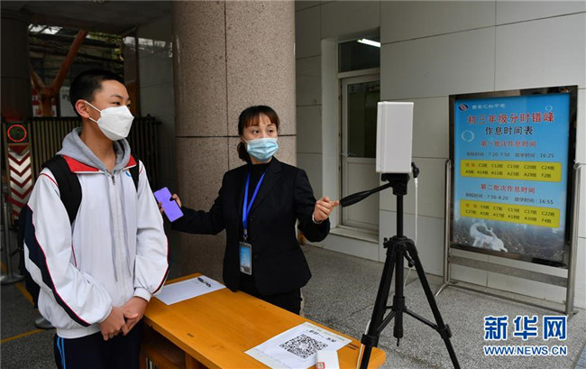 4月7日,西安匯知中學(xué)初三學(xué)生進(jìn)入校園時(shí)測量體溫。