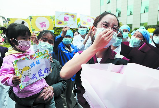 “看到你們平安回來,我們就放心了!”下午2點(diǎn)40分左右,當(dāng)隊員們走下大巴車時,早已等候在此的醫(yī)院領(lǐng)導(dǎo)、職工和家屬紛紛迎上前去,為他們獻(xiàn)上鮮花和擁抱。在第一住院大樓前,醫(yī)院舉行了簡單而隆重的歡迎儀式,隊長張文婷匯報了醫(yī)療隊工作情況,面對大伙的熱情迎接,她激動得流下眼淚,幾度哽咽:“雖然前方工作辛苦,但能圓滿完成黨和國家交付的任務(wù),我們都覺得十分驕傲!”儀式現(xiàn)場,一面寫著“逆行抗疫 大愛無疆”的錦旗引人注目,這是武漢大學(xué)人民醫(yī)院東區(qū)五病區(qū)一名患者為感謝省醫(yī)院醫(yī)護(hù)人員,專門從武漢寄到成都來的,短短八個字,卻飽含感恩和敬意。
