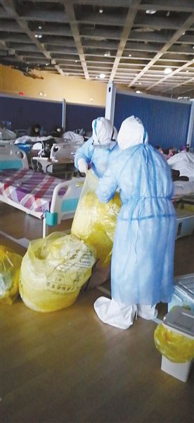 ▲護理人員在武昌方艙醫(yī)院辛勤工作。