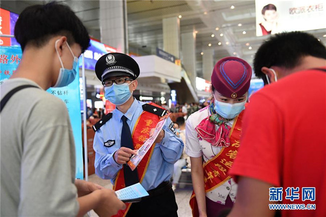 5月25日,在重慶北站北廣場候車廳,鐵路工作人員向候車旅客宣講鐵路安全知識和疫情防控知識。新華社記者 唐奕 攝