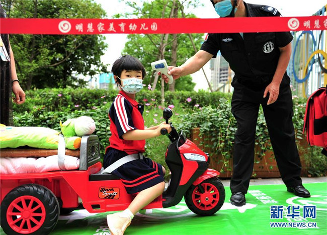 6月2日,成都市龍泉驛區(qū)明慧家美育幼兒園恢復(fù)開園,小朋友在測量體溫。新華社發(fā)(胥冰潔攝)