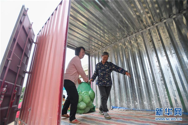 6月4日,在湘潭市雨湖區(qū)鶴嶺鎮(zhèn)龍安村,湘潭市仙女蔬菜產(chǎn)銷專業(yè)合作社的農(nóng)戶將采摘的包菜裝車。新華社記者 陳澤國 攝