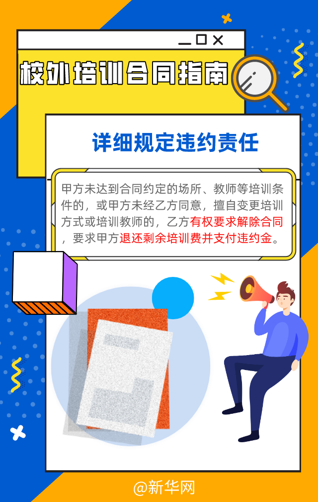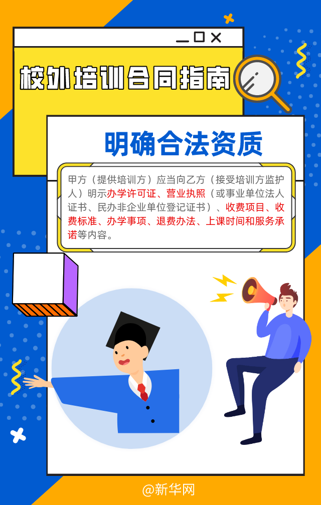 長期以來,校外培訓機構的資質問題,以及部分培訓機構存在違規(guī)收費、退費難、卷款“跑路”現(xiàn)象,這些令學生和家長發(fā)愁。教育部、市場監(jiān)管總局近日發(fā)布《中小學生校外培訓服務合同(示范文本)》,供培訓者(學員)監(jiān)護人與開展中小學生校外培訓的培訓機構簽訂培訓合同時參照使用,為規(guī)范校外培訓做出新的探索。一起來看看,這份“國家版”標準合同有哪些亮點?