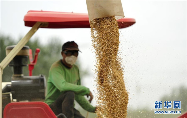 6月21日,河北省河間市景和鎮(zhèn)豐爾莊村農(nóng)民在麥田收獲小麥。 新華社記者 朱旭東 攝