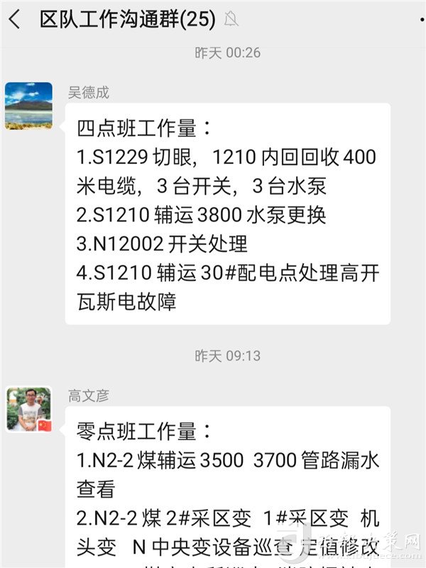 “南翼1210回風(fēng)巷回收400米低壓電纜”“南翼1210輔運3800米處更換水泵一臺”......凌晨十二點半,剛下晚班的跟班副區(qū)長吳德成便用手機編輯信息,將當(dāng)班任務(wù)完成情況匯報至區(qū)隊工作微信群。