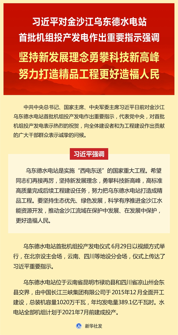 原標(biāo)題:習(xí)近平對金沙江烏東德水電站首批機(jī)組投產(chǎn)發(fā)電作出重要指示強(qiáng)調(diào) 堅持新發(fā)展理念勇攀科技新高峰 努力打造精品工程更好造福人民